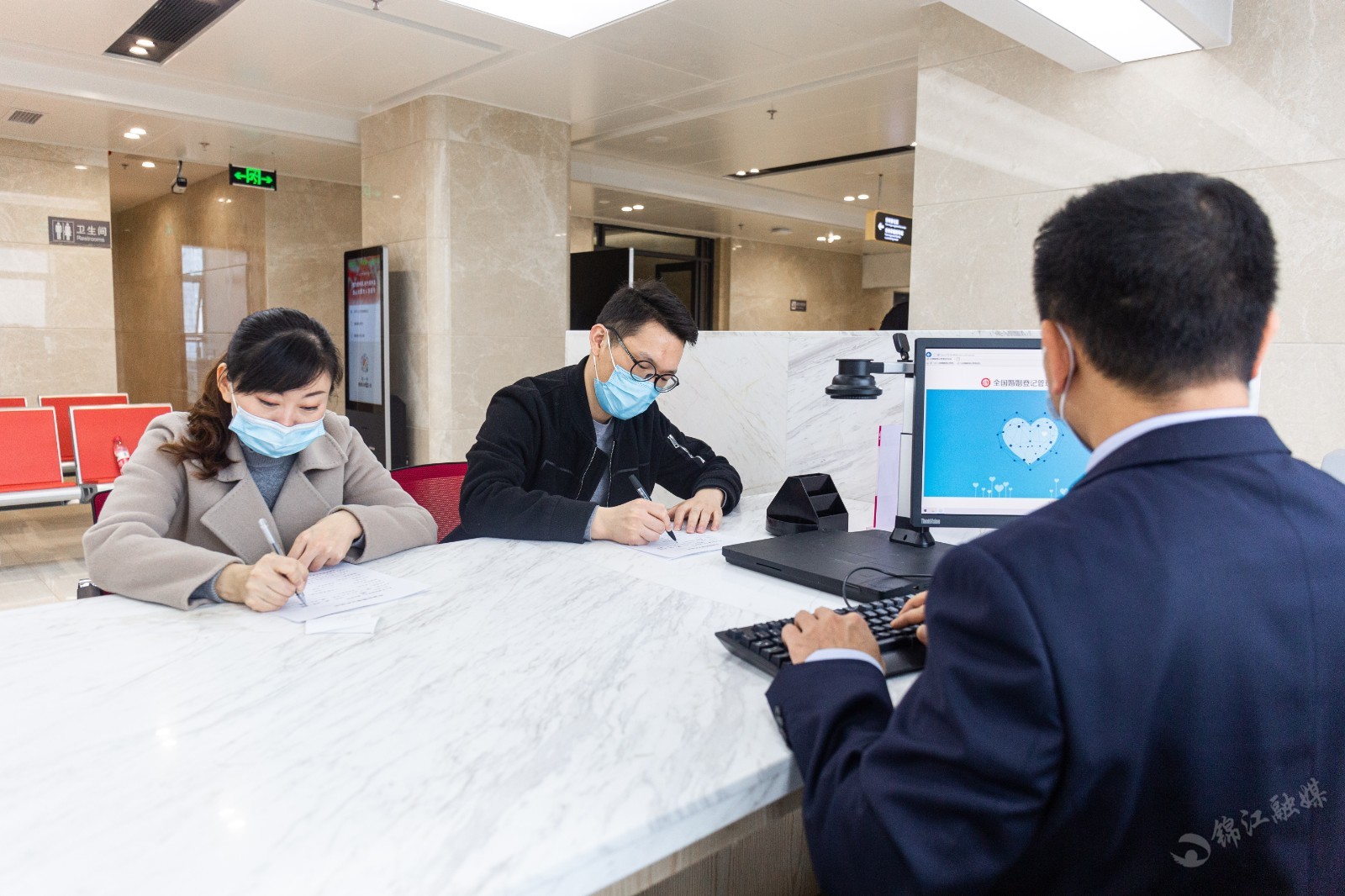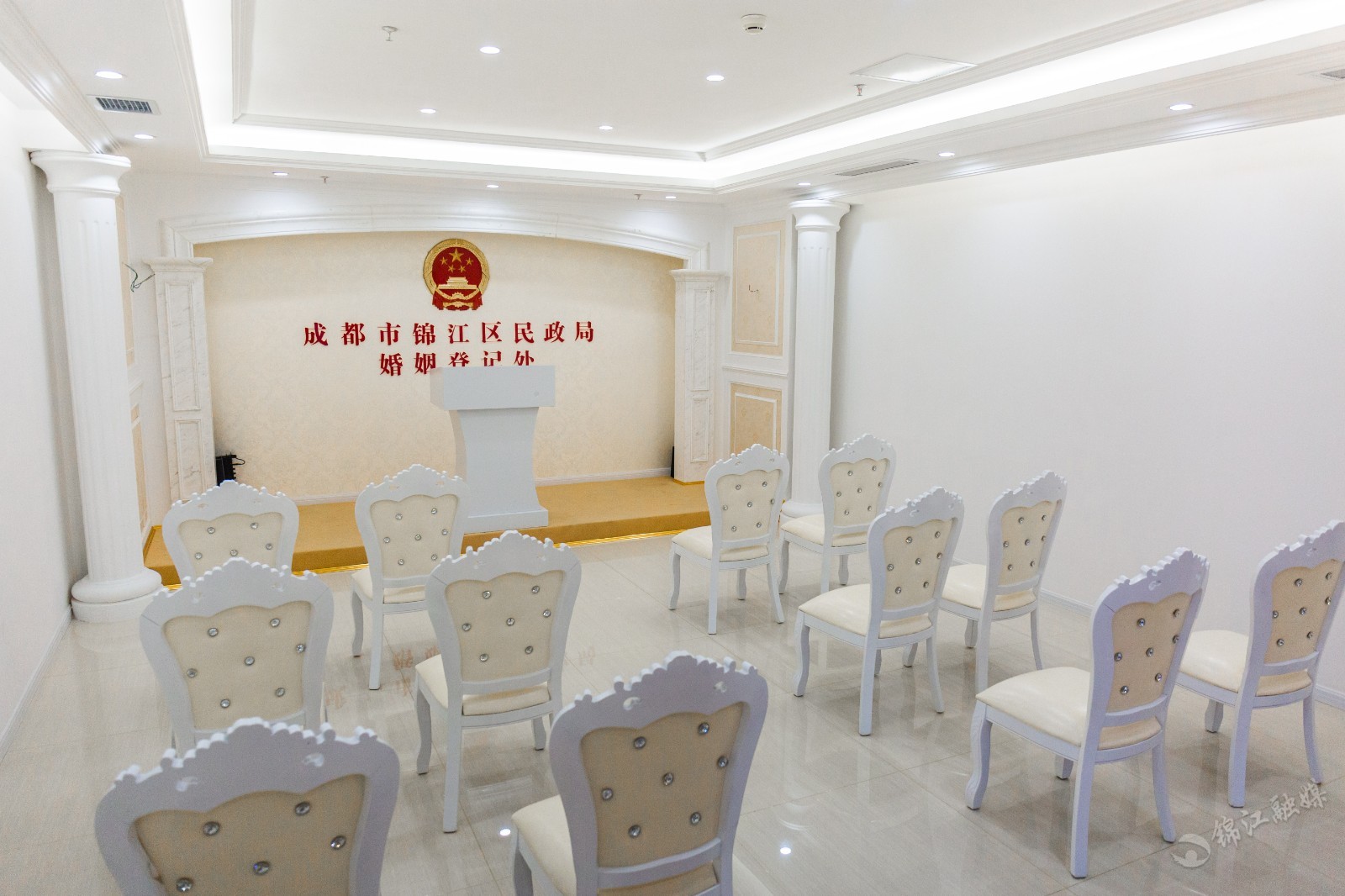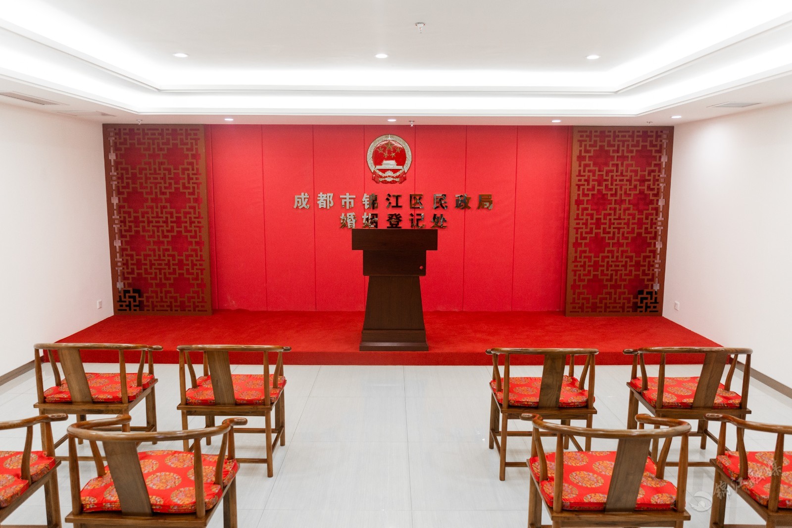 中式与西式两个不同风格的颁证大厅宽敞明亮,可同时容纳十余人共同观礼;6个结婚登记窗口进一步提升服务效率,缩短了市民等候时间;2个离婚登记室各自独立,充分保障市民的隐私……全新亮相的锦江区民政局婚姻登记处秉承着"我为群众办实事"的初心,不仅在环境上实现了提档升级,还可为市民提供更加规范、专业、高效、便民的婚姻登记服务。区民政局相关负责人表示:"新的婚姻登记处按照国家民政部5A级婚姻登记机关标准打造,使用面积为1050平方米,是过去面积的3倍,增加了自助服务机,可以免费为市民提供身份证、户口本复印等服务,让婚姻登记更加便捷。"